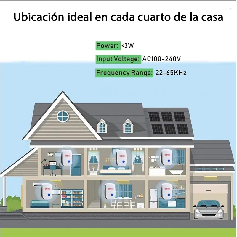 - Tecnología de Conversión de Frecuencia Inteligente: Cambia automáticamente las frecuencias ultrasónicas para evitar que las plagas se adapten.