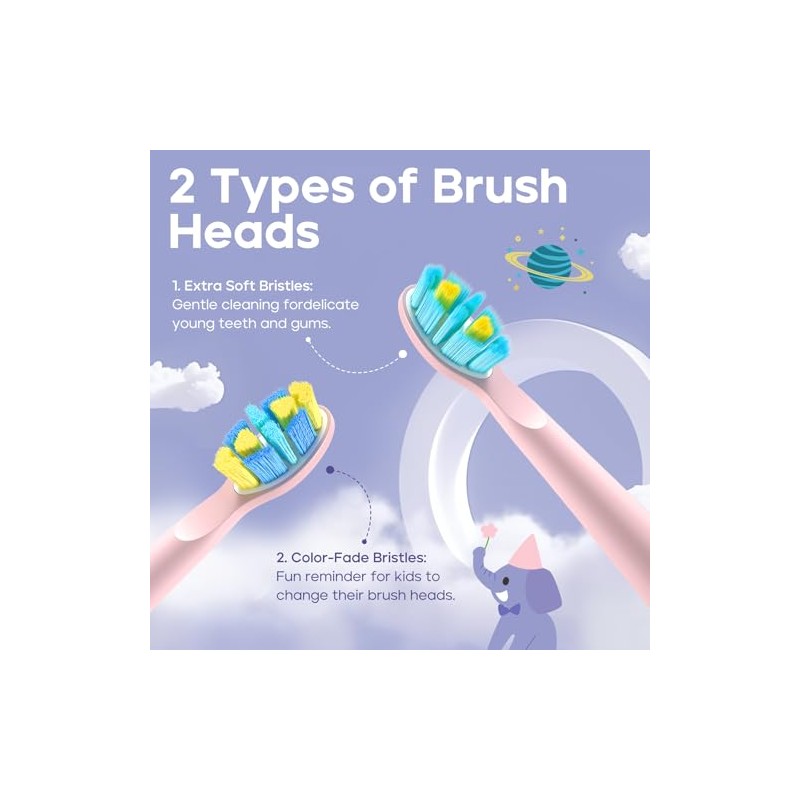 - Color Fade Reminder for Optimal Hygiene : The 2 color fade brush heads help remind parents when it's time to replace the brush head. When the bristles change color, it's time to swap them out, ensuring consistent cleaning effectiveness and maintaining good hygiene