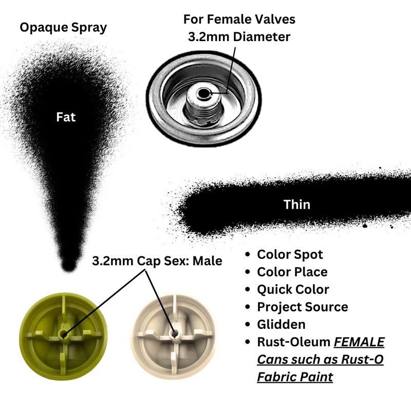 Replacement Caps For FEMALE Cans Wide and Thin Spray. These are made to fit; Color Spot, Color Place, Quick Color, Project Source, Glidden or Female Rust-O Cans like Rust-O Outdoor Fabric Paint These are MALE caps. They are also known as Boston Caps The white caps produce a spray that is 0.5"-1" wide with little overspray, the green caps spray 3-4" wide great for large coverage areas.