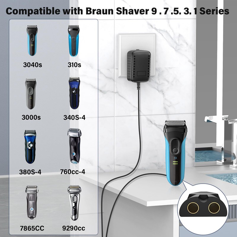 - Compatibility: Replacement for Braun Shaver Charger Adapter: Compatible with Braun Series 5 charger:5040s, 5542,5585, 5611, 5612, 5885, 5790, 5795, 5796, 5770, 5776, 5779, 5873, 5874, 5875, 5876, 5877, 5878, 5884, 5886, 5895, 5897, 5325, 5496, 5708, 5710, 5713, 5714, 5720, 5721, 5722, 5723, 5724, 5729, 5730, 5733, 5735, 5737, 5738, 5739, 5742, 5747, 5773, 5775, 5759, 5692, 5693, 5694, 5695, 5696, 5697, 5671,5673, 5674, 5675, 5693. Replacement for Braun power cord:compatible with Braun Epilator Silk Epil 3 5 7 9 series shaver razor