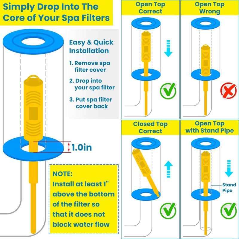 - Perfect Design — Simply drops into the core of most spa filters in seconds for easy installation & hassle-free maintenance. Cartridge replacement every 4 months is recommended for optimal performance. Comes with support stems, instruction and schedule. These stems keep the main body in the middle of the filter to avoid sitting on bottom of filter which can block the return pipe.