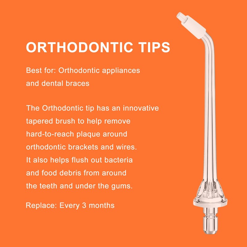 • 【Orthodontic Tips】The Tips are designed to clean around braces and dental work. The tapered brush removes hard-to-reach plaque around orthodontic brackets and wires. It also helps flush out plaque and food debris from around the teeth and under the gums.