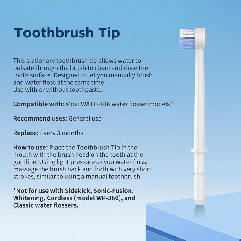 • Combining the power of water flossing with the convenience of a manual toothbrush, the Toothbrush Tip allows simultaneous brushing and flossing.