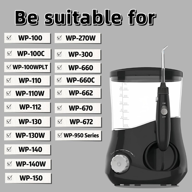- Portable water flosser compatible WP-100, WP-100W, WP-100C,WP-100W/C, WP-100WPLT, WP-110, WP-110W, WP-112, WP-130, WP-130W, WP-140, WP-140W, WP-150, WP-250, WP-270W, WP-300, WP-660,WP-660C, WP-662, WP-670, WP-672, WP-950, WP-900 Series.Please make sure the model matches before buying.