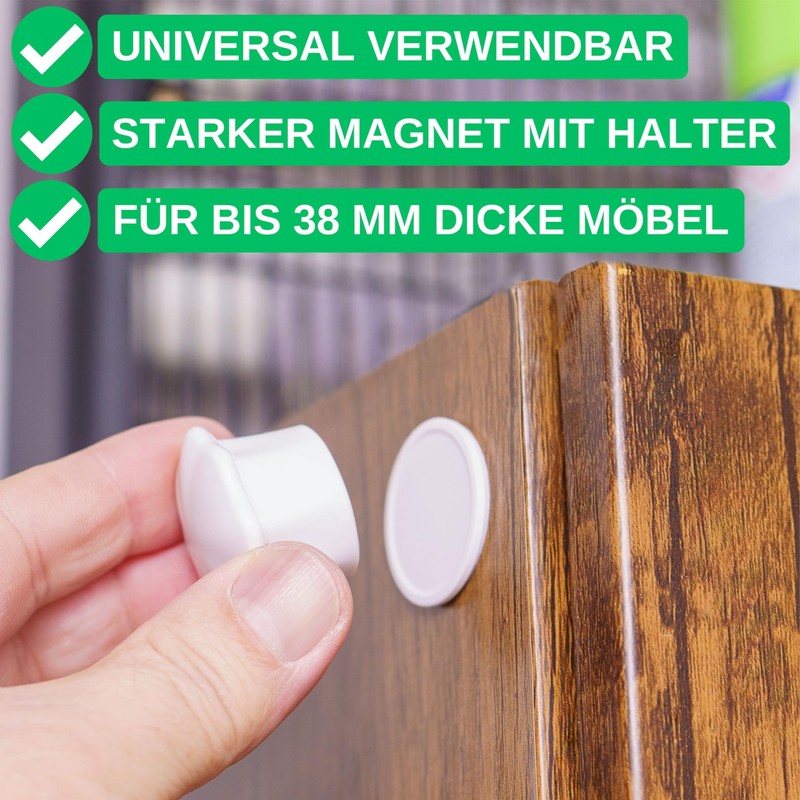 The strong magnet opens and closes the baby lock with up to 38 mm thick furniture wall thicknesses.
