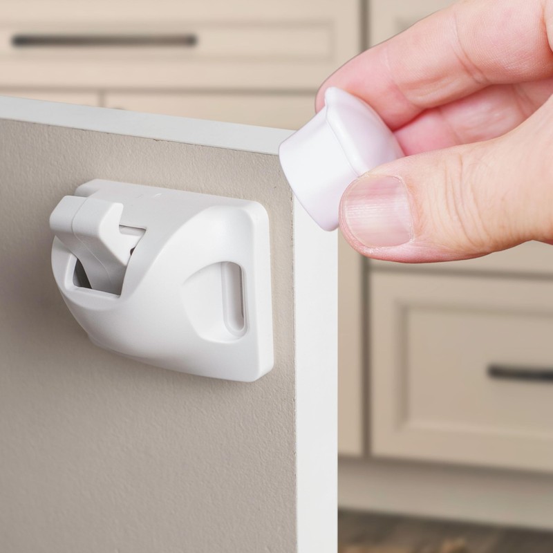 - Box contents: 2 x magnetic lock for invisible child lock, 2 x magnetic locks adhesive holder, in white, made of plastic, can be used for most systems.