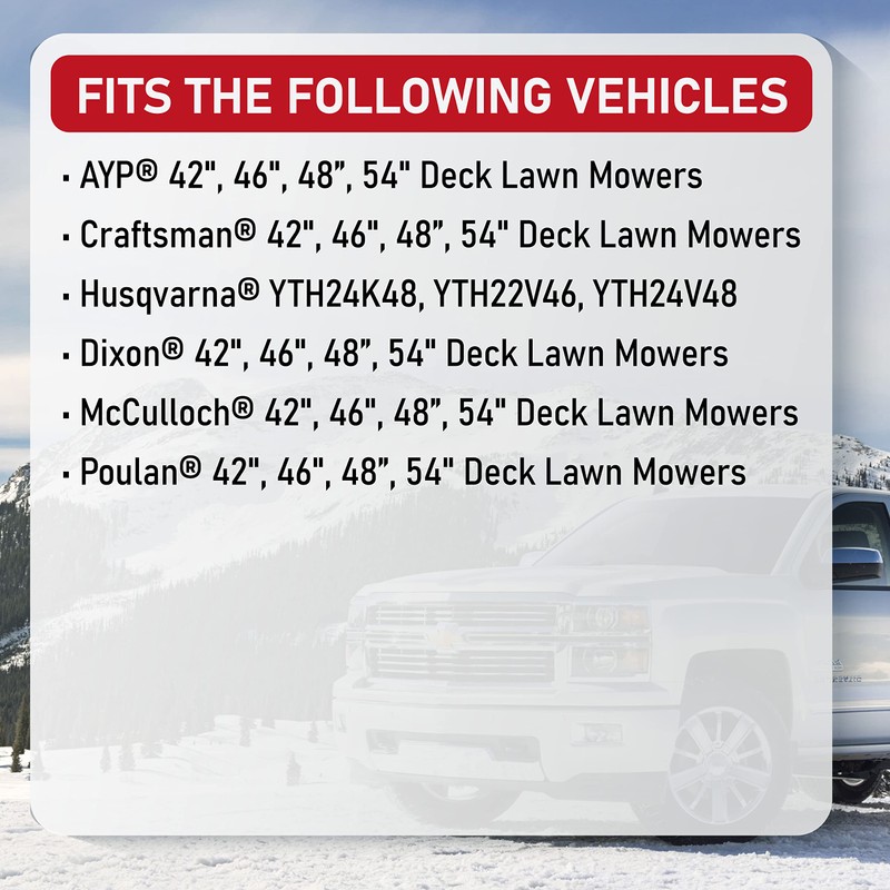 - Replaces Part# Ariens: 21546238, 21546299, 21549012 | AYP, Craftsman, Dixon, Husqvarna: 187292, 192870, 532187281, 532187292, 532192870, 53911207 539112057, 587125401, 587253301 | McCulloch: 532 19 28-70 | Poulan: 532192870 commonly found on popular riding mowers Husqvarna YTH24K48, AYP, Craftsman, Dixon, McCulloch and Poulan with 42 inch, 46 inch 48 inch and 54 inch Mower Deck. This spindle assembly includes the mounting bolts necessary for a proper replacement.