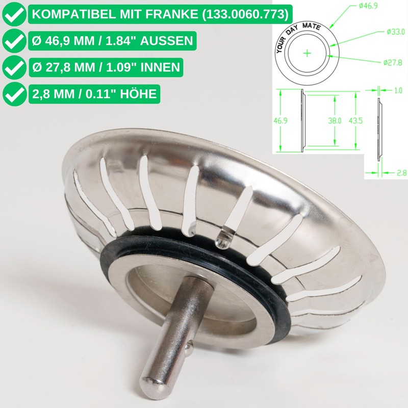 - Strainer basket replacement seals compatible with Franke sealing ring item number 133.0060.773: these plug replacement seals are suitable for 3.5 inch drain fittings - the strainer basket seal is not an original part.