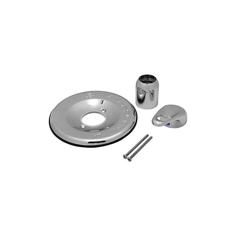 - INCLUDES: Chrome D shape handle which includes index button, set screw, and alan wrench. A chrome valve body cover, chrome cap, chrome escutcheon plate (approximately 6-1/2 inches in diameter) & two escutcheon plate mounting screws.