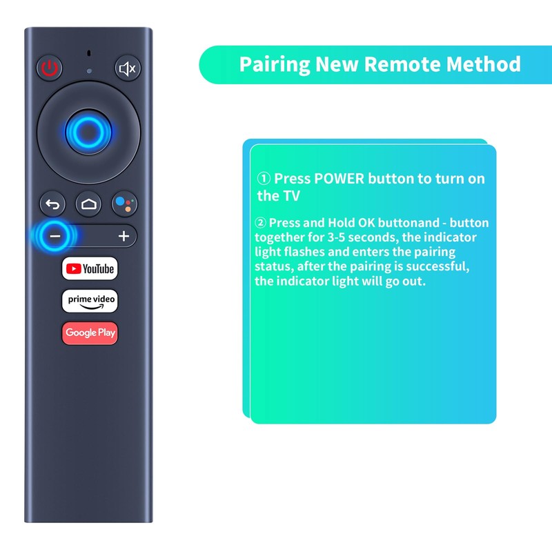 • Pairing New Remote Method: ① Press POWER button to turn on the TV; ② Press and Hold OK button and - button together for 3-5 seconds, the indicator light flashes and enters the pairing status, after the pairing is successful, the indicator light will go out.