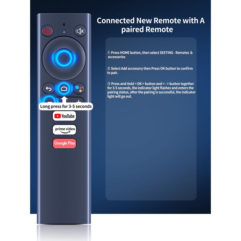 • Connected New Remote with A paired Remote: : ① Press HOME button, then select SEETING - Remotes & accessories. ② Select Add accessory then Press OK button to confirm to pair. ③ Press and Hold < OK > button and < - > button together for 3-5 seconds, the indicator light flashes and enters the pairing status, after the pairing is successful, the indicator light will go out.