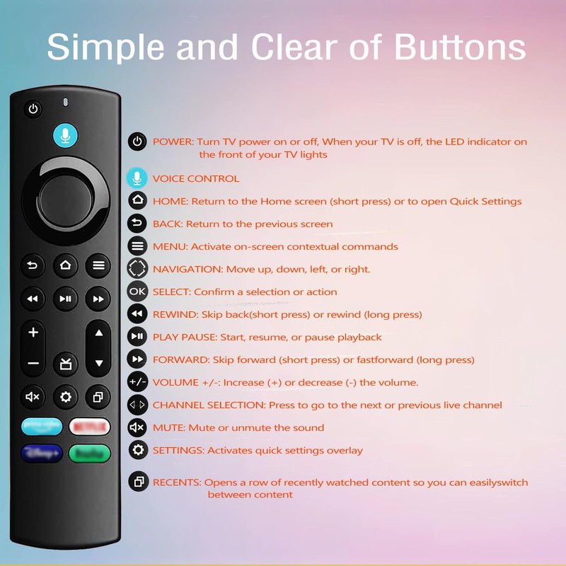 • Compatible With Models: This upgraded replacement voice remote could compatible for Insignia Smart TVs: F30 F20 F50 DF710 DF711 DF310 DF510 DF311 DF620 series; for Toshiba Smart TVs: LF711 LF621U LF421U LF221U C350 A810U A710U M550 V35 series; for Pioneer TVs PN450 PN651 PN851 PN951 series; for Omni Series Smart TVs; AMZ 4-Series Smart TVs; for FireSmart TV Stick(4K/4K Max/Lite/1st 2nd 3rd Gen), for FireSmart TV Cube, and Smart TV(3rd Gen), etc