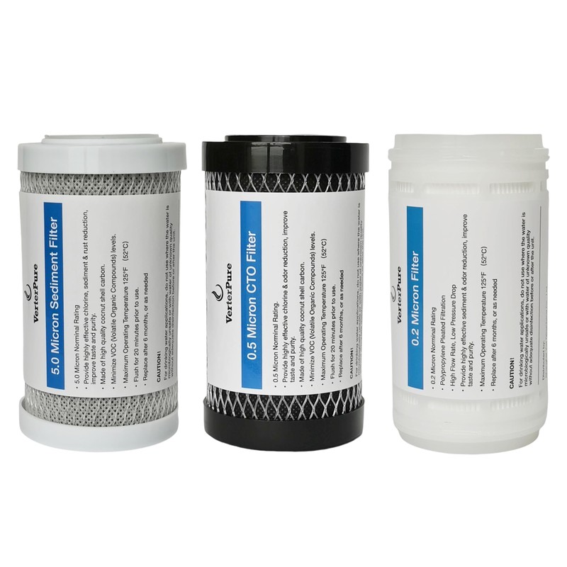Original Equipment Replacement filters for VerterPure S3 Mini water filtration system, include three 5 inch filters to protect against a wide range of contaminants, including chlorine, bad taste, odors, and more. The 1st stage is a 5.0-micron sediment cartridge, it reduces heavy sedimentsit, filters out dirt, sand, silt, and rust from water. The 2nd stage is a 0.5-micron coconut shell carbon block cartridge, it improves taste and smell, removes or reduces sediment, chlorine, chloramines, VOCs, and other contaminants. The 3rd stage filter is a 0.2-micron pleated cartridge, it is great for reducing particulates commonly associated with well water and city water including very small submicron particles, minimizes more contaminates from your camper’s fresh water supply.