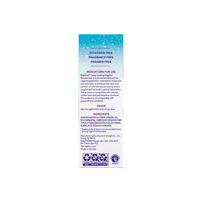 From the #1 Doctor Recommended Vaginal Moisturizer Brand, Replens Long-Lasting Vaginal Moisturizer with Single-Use Applicator, 8 Count helps replenish vaginal moisture and supplements the body's natural lubrication. It is estrogen free, fragrance free and formulated for regular use. Each application of Replens Long-Lasting Vaginal Moisturizer provides moisture for up to three days when used regularly. Replens Vaginal Moisturizer provides moisture at the source of discomfort. The Replens formula stays in place to deliver moisture for long-lasting hydration. Replens Long-Lasting Vaginal Moisturizer includes 8 pre-filled, single-use applicators and a bonus FREE sample of Silky Smooth Personal Lubricant.