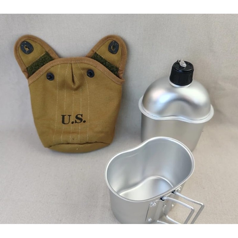 - Dimension is 6.7"x7.5"x4.5", weight about 2 lbs. The canteen with the U.S. mark in front. Canteen cover is made of canvas material, the linner is made of the felt material. Canteen body is made of aluminum material, inside of the canteen cap attached the rubber seal ensure it wouldn't leak water It also features the reinforced metal hook in the back, it can connect it with the US belt.