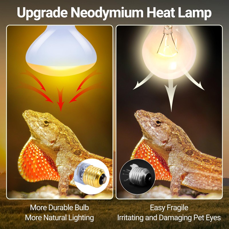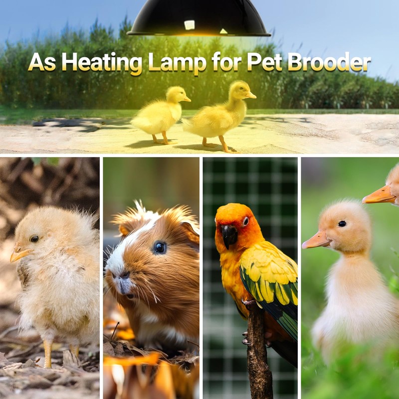 - 【Widely Used】: Heating lamps can work together with dimmers and thermostats. It is not only applicable to reptiles and amphibians, such as bearded dragon, leopard gecko, lizard, ear slider, tortoise, hermit crab, etc., but also applicable to birds, such as chickens, ducks, pigeons, parrots, etc