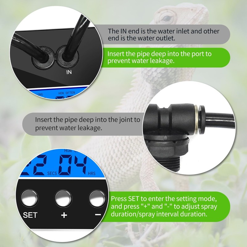 RUNWUSHENG reptile humidifier, LCD with timing function, time length and interval can be set, reptile mister system with 2 spray nozzles, misting system for reptiles of amphibians, tanks, Paludarium