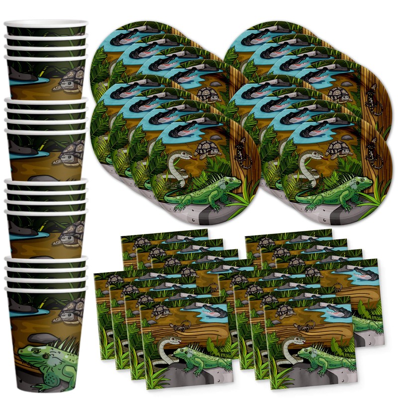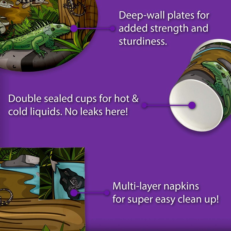 - PREMIUM DESIGN - Our Reptile Themed Party Supplies are suitable for girl’s and boy’s birthday parties, holiday celebrations with your family and friends, special events or for just fun-filled daily meals, snacks, and desserts with picnics and cookouts. Shrieks of joy will be your reward when you use these fun and unique party tableware sets.