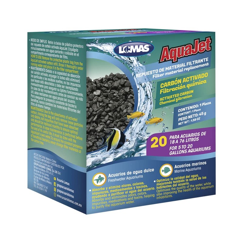 - Los repuestos de carbón activado Aquajet son un filtro químico para acuarios, con gran porosidad para mayor porcentaje de adsorción de sustancias muy nocivas para el acuario como el amonio y el amoniaco.