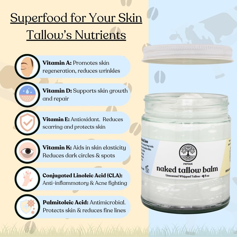 • USED FOR 1000'S OF YEARS BY OUR ANCESTORS. One Ingredient, Unlimited Uses: Safe to use anywhere, and helps with almost everything. Discover the simple and powerful versatility of our "Naked Tallow Balm," made exclusively from 100% Grass-Fed, Grass-Finished Beef Tallow. This all-in-one balm is your go-to for hydration, healing, and much more, suitable for the entire family's skin care needs.