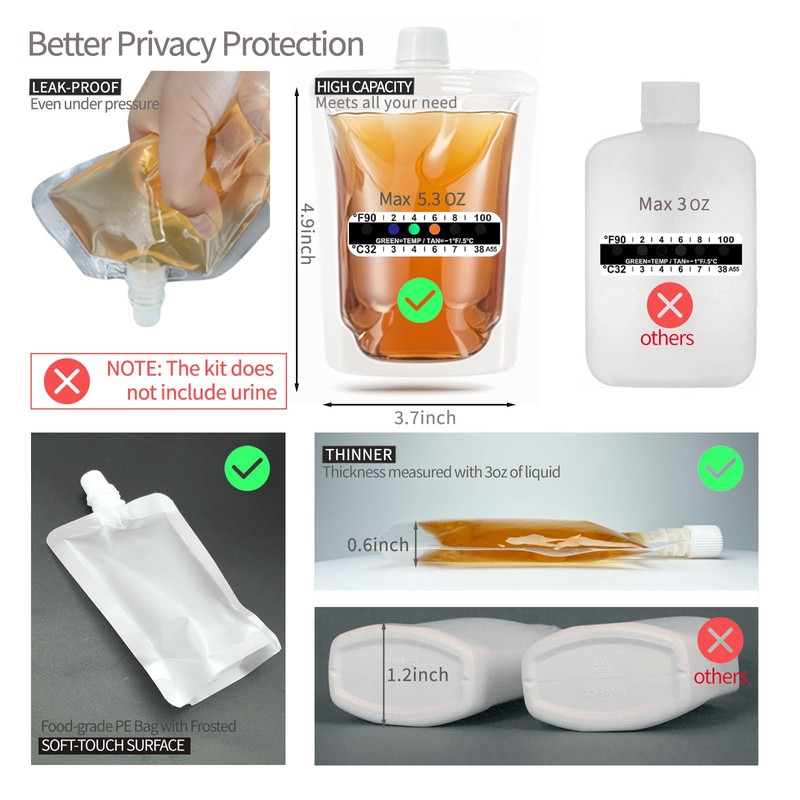 - User-Friendly Operation:Our urine test kit simplifies the process of measuring urine temperature. Simply stick the test strip on the side of the bag, pour urine through the funnel quickly (without touching your hands), and the temperature will be displayed immediately. The test strips are color-coded for easy temperature reading, saving you time and effort.Do strenuous exercise will not fall off, without producing any water sloshing sound.