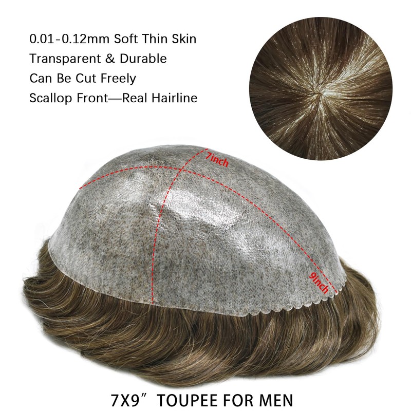 - Default cap size of this thin skin toupee for men is 7"x9", 8”X10”, this mens toupee is big enough for most head size, also can be cut to small size according to your demand. 6 inch soft Indian human hair Piece for Men. 32mm Slight wave. Tangle free. No shedding.
