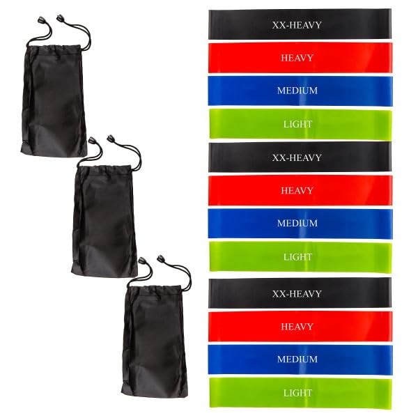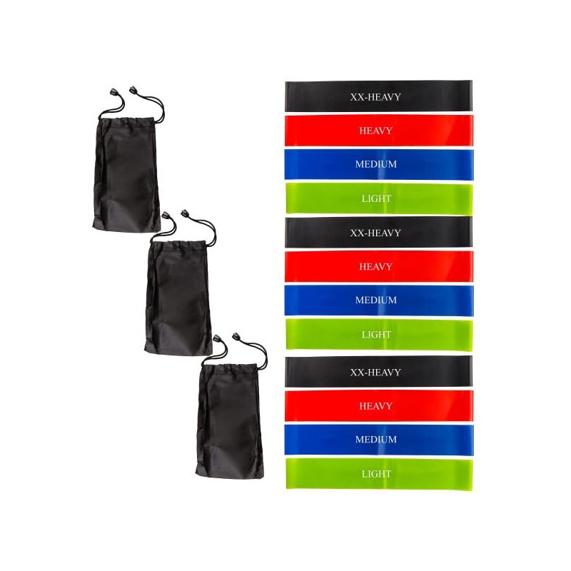 - PRODUCT DETAILS - Materials: 100% Natural Latex. Dimensions: (L) 12" x (W) 2". Resistance Band 12-Pack includes 3 each of Light, Medium, Heavy, and Extra-Heavy Loop Bands. Carry Bag Included. Color: Multicolor.