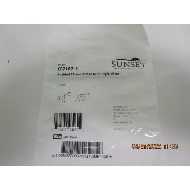 Sunset health care solutions, item # CF2107-1 for ResMed S9 and AirSense 10; CPAP filters; 1pack, Brand New in sealed package; UPC 8 48530 03269 2 measures 2x1.5”.