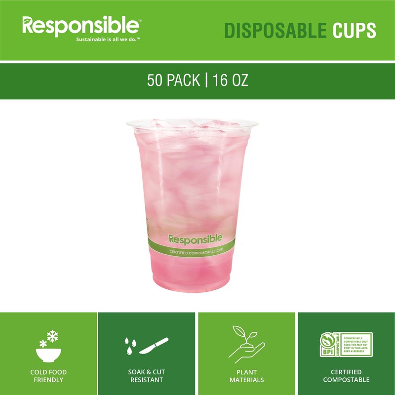 Responsible Products 16 oz Clear Cold Cup, Certified Compostable and Made from 100% American Biobased Materials, No-PFAS Added & BPA-Free (50 Count)