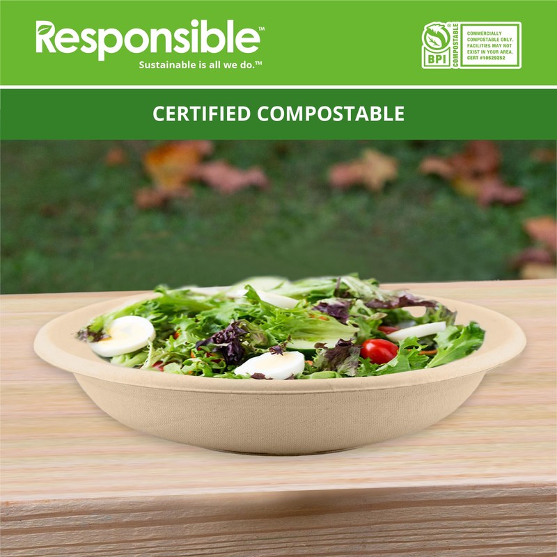 Responsible Products 24 oz Bowls, Tree-Less™ Compostable Molded Fiber Bowls, Extra Strength, Tree-Free and Made Without PFAS, Natural Brown (50 Count)