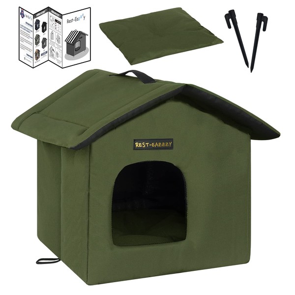 Rest-Eazzzy Cat House for Outdoor Cats, Weatherproof and Insulated Feral Cat House with Mat and Clip, Easy to Put Together, Selfwarming Cat Shelter for Winter(Olive Green, Canopy House X 1)