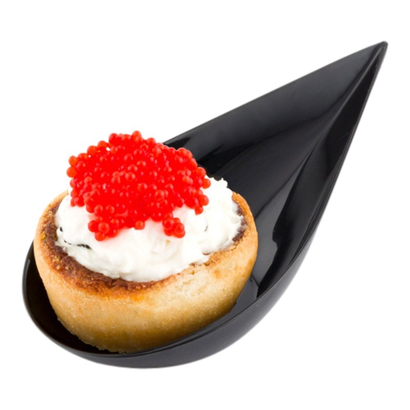 Create attention-grabbing appetizer and dessert displays with these Black Teardrop Appetizer Spoons. Featuring a contemporary teardrop design, these black plastic plates add a touch of modern elegance to any occasion. Their wide, indented basins expertly contain your culinary creations, while their polished black finish easily matches any venue or decor. Built with a flat base and a sleek pointed handle, these mini appetizer spoons are designed to add trendsetting sophistication to any food presentation. Each of these plastic appetizer plates measures 4 inches in length and has a capacity of up to 1 ounce. Ideal for cocktail parties, tasting events, and other catered functions, these upscale appetizer spoons are conveniently disposable for quick and easy cleanup. Sold in a 100 count box.