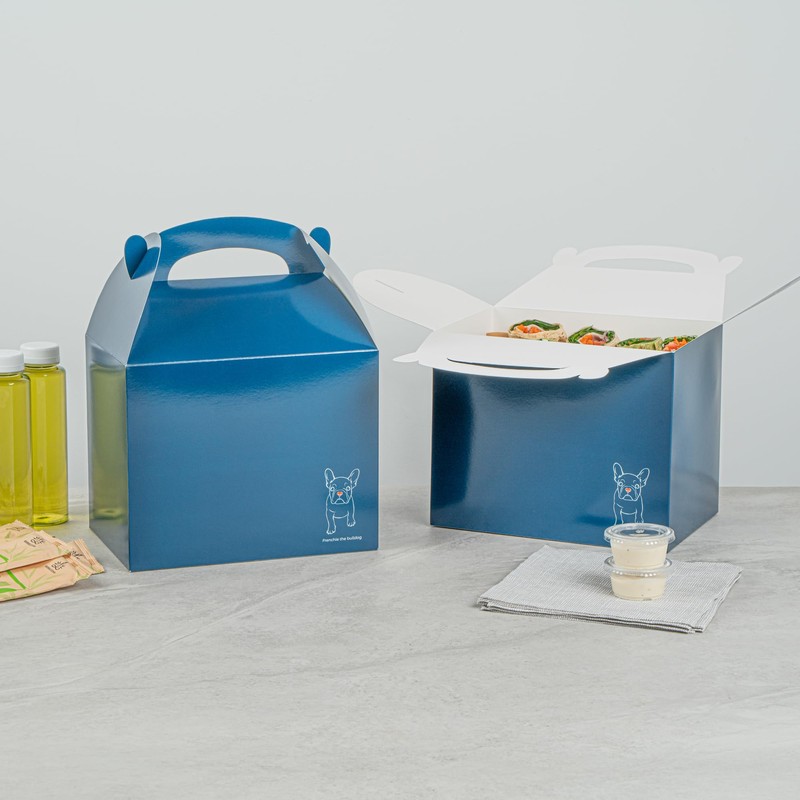 Restaurantware Bio Tek 10 x 7 x 8 Inch Gable Boxes For Party Favors, 100 Paper Gift Treat Boxes - Frenchie The Bulldog Design, With Built-In Handle, Blue Paper Barn Boxes, Disposable