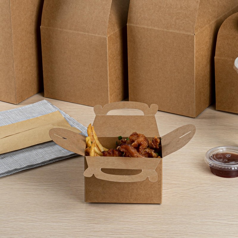 Restaurantware Bio Tek 4 x 2.5 x 2.5 Inch Gable Boxes For Party Favors, 25 Attractive Gift Boxes - With Built-In Handle, Greaseproof, Kraft Paper Gable Boxes, For Birthday Parties And Weddings
