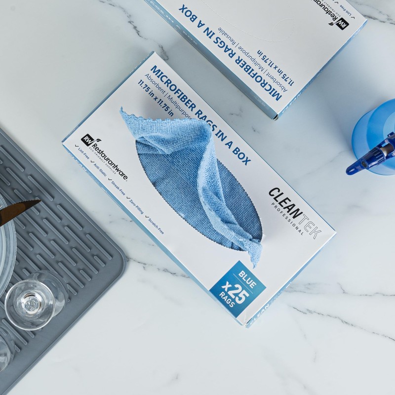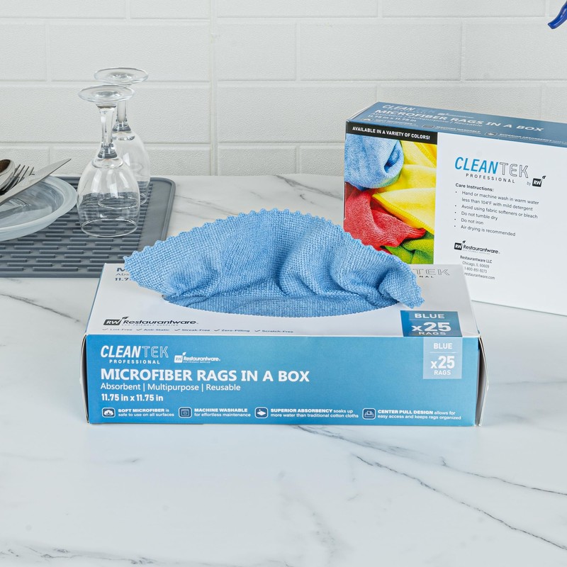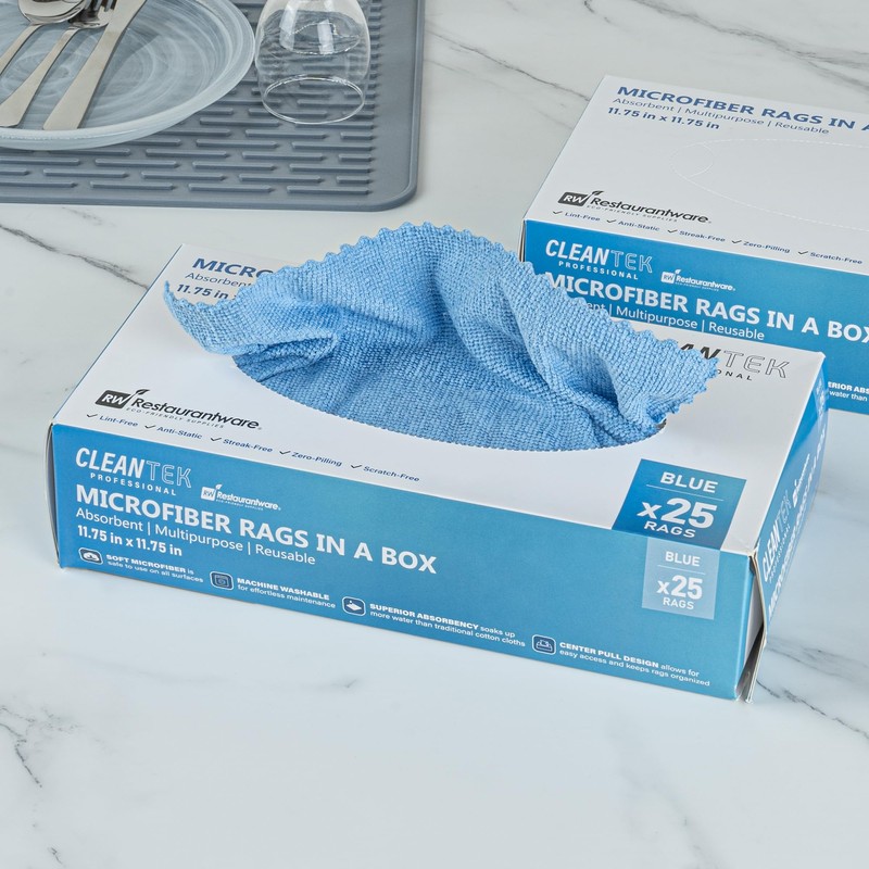 Restaurantware Clean Tek Professional 11.81 x 11.81 Inch Microfiber Rags in a Box, 25 Absorbent Cleaning Cloths - No-Scratch, Blue Microfiber Reusable Edgeless Cleaning Towels, Leaves No Streak