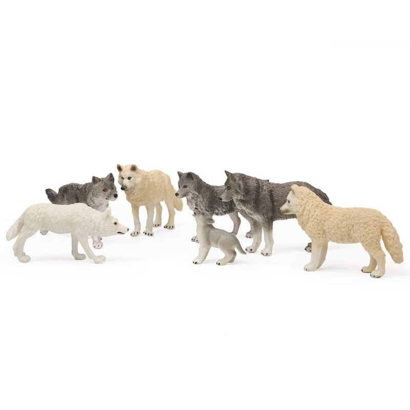 • 7pcs Wolves Toy Figures Set includes: 1 Grey Wolf Standing, 1 Grey Wolf Running, 1 Grey Young wolf, 1 White Standing Wolf, 1 White Hunting Wolf, 1 White Young wolf, 1 White Wolf Cub.