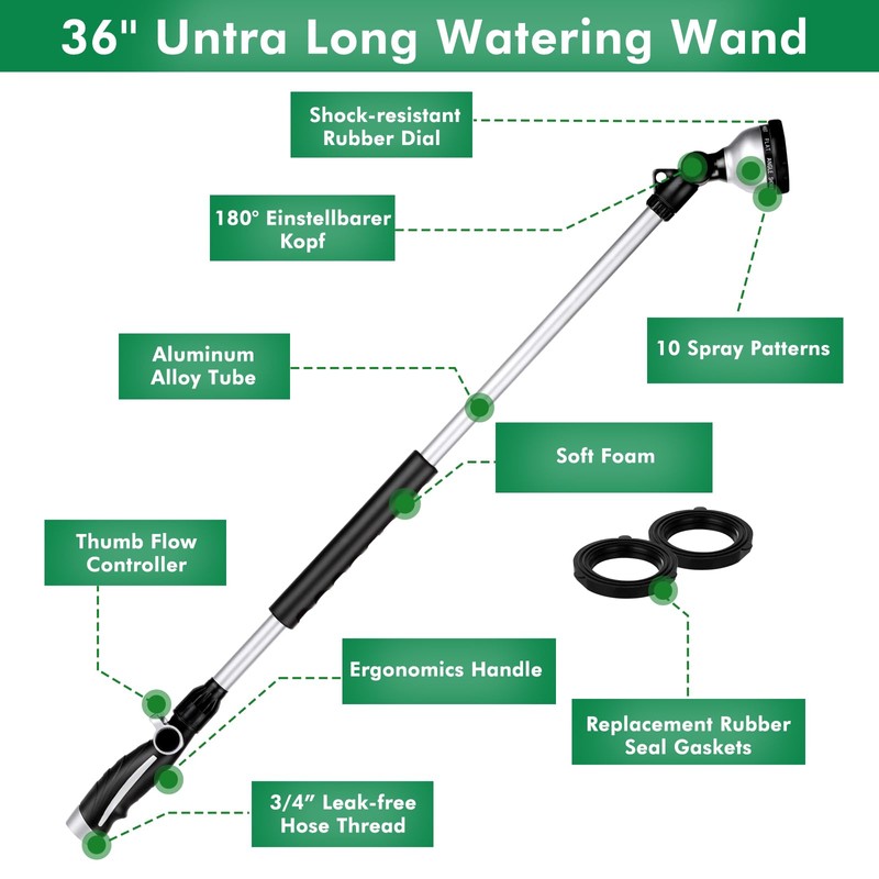 - 【3ft Ultra-Long Watering Wand】This garden hose wand features with a long aluminum alloy tube which helps you to reach hanging baskets, shrubs, roofs, windows and those hard-to-reach areas in your lawn and garden. The 180 degree ratcheting head also provides much more convenience and flexibilities for your garden watering, car washing and patio cleaning.