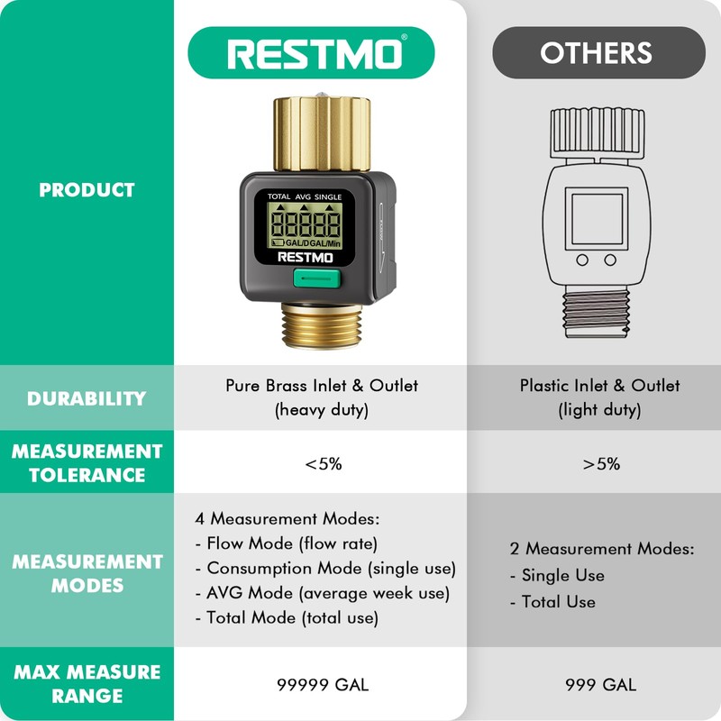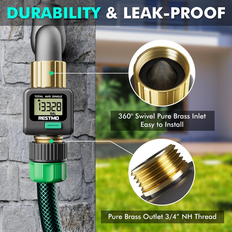 RESTMO Water Flow Meter with Brass Inlet & Outlet, Measure Gallon/Liter Consumption and Flow Rate for Outdoor Garden Hose Watering, RV Water Tank Filling, Lawn Sprinkler and Nozzle Sprayer
