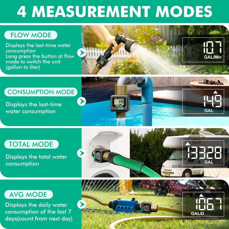 • Equipped with an easy-to-read LCD screen and one-touch control push button, this water flow meter can easily display and track the water usage & flow rate of your outdoor garden hose with 4 different measurement modes.