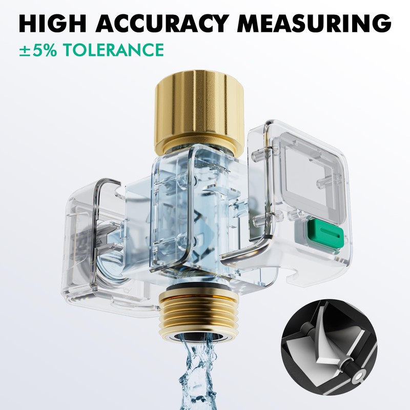 • Built-in with hall type sensor and IC chipset, which provide more accurate measurement and precise calculations. The measurement tolerance is less than 5%, great to measure how much amount of water are used and prevent over-watering.
