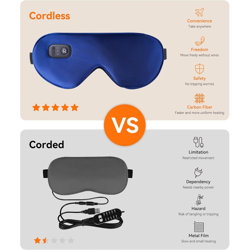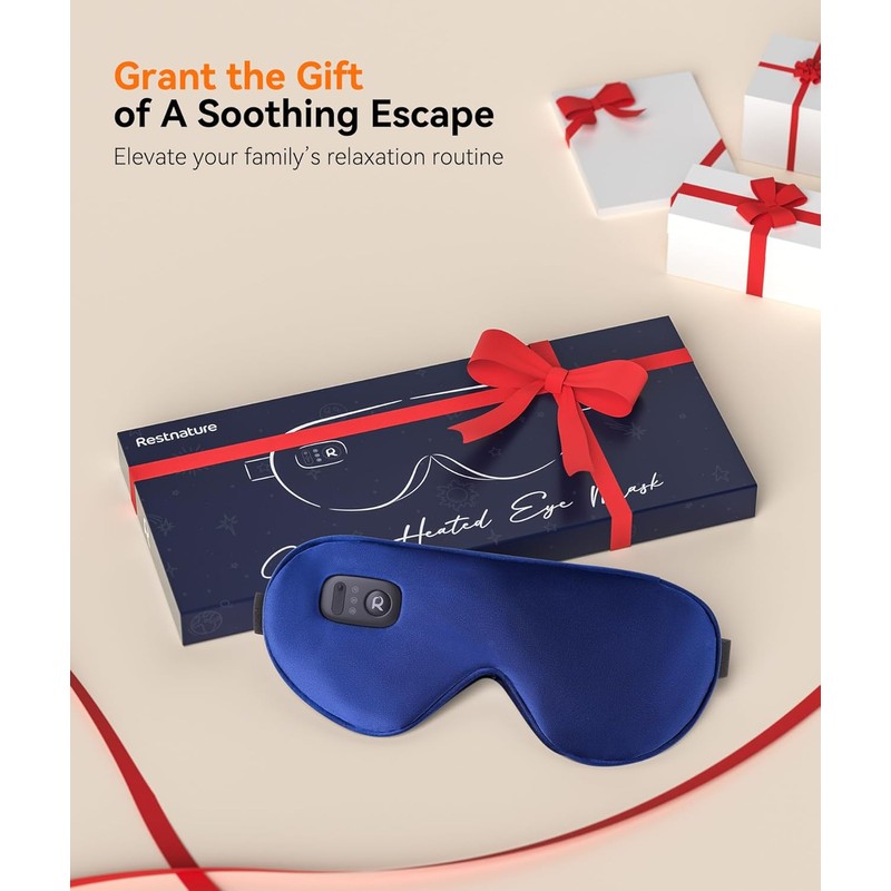 Restnature Cordless Heated Eye Mask – Rechargeable and portable warm eye compress for dry eyes, puffiness, and eye strain relief. Features advanced carbon fiber heating, adjustable heat (35°C-45°C), a timer (10-30 min), and a secure fit. Includes a soothing spray bottle and earplugs for enhanced relaxation—perfect for home, travel, or as a thoughtful gift.