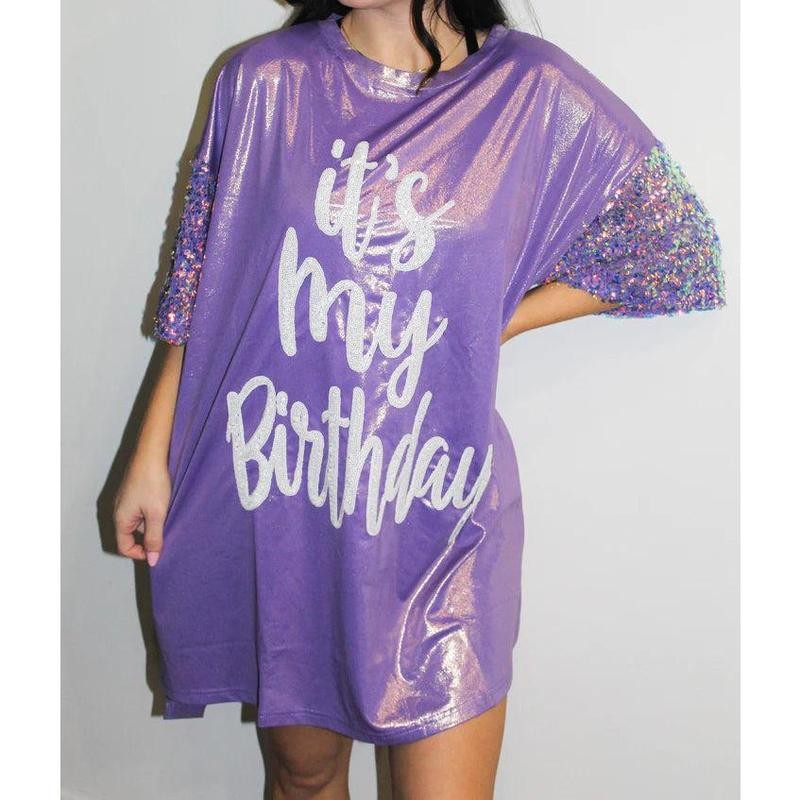 Birthday Queen Foil Sequin Dress in LavenderBirthday Queens ONLY! Hello gorgeous?! Yeah, you! We see you eyeing this amazingness. We fully believe every bday gal needs one of these in her wardrobe for her big day. Photoshoot ready ✅ 21st Birthday ✅ Dirty 30 ✅ Sexy 40 ✅ We got you boo! Just grab it because it's THAT necessary to have. ☺Item Deets: Coated pearlescent bodiceRound necklineSequin short sleevesHigh-low side sitsGraphic printSmall: 2-6Medium: 6-12Large: 12-16Brand: Fantastic Fawn