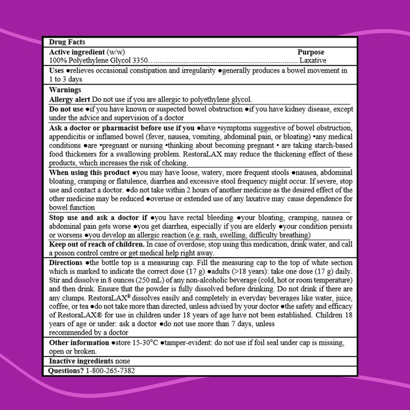 - Restoring your body's natural rhythm - RestoraLAX is an osmotic laxative containing 100% polyethylene glycol 3350 powder that works with the water in your body to soften and hydrate stool, and increase frequency of bowel movements.