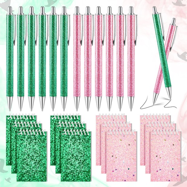 - Pink and Green Notebook Pens Set: includes 12 mini spiral-bound notebooks (6 pink, 6 green) and 12 glitter pens (6 pink, 6 green); The notebooks feature shimmer covers with 20 blank pages, paired with sparkly pens, ideal for journaling or gift-giving