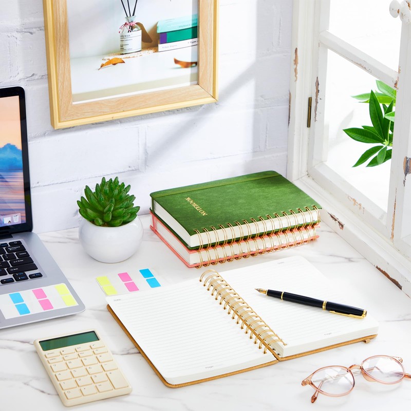 - Reinforced Metal Double Coil Design: the spiral notebook features a gold tone metal double coil binding, which not only enhances the visual appeal but also ensures that the pages lie flat when opened; This binding allows users to fold the notebook completely when space is limited; Unlike glued spines, the reinforced coils provide reliable sturdy in daily use, making it suitable for both short-term projects and long-term documentation