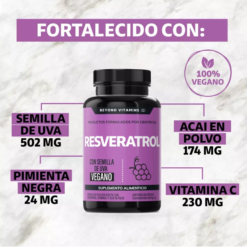 🌟 ⭐ Resveratrol 100% Vegano de alto contenido en Polifenoles | Pimienta Negra Para Mejor Absorción, Vitamina C, Semilla De Uva Y Acai Beyond Vitamins Antioxidante | Vitaminas Mujer / Hombre - 180 Capsulas ⭐ 🌟