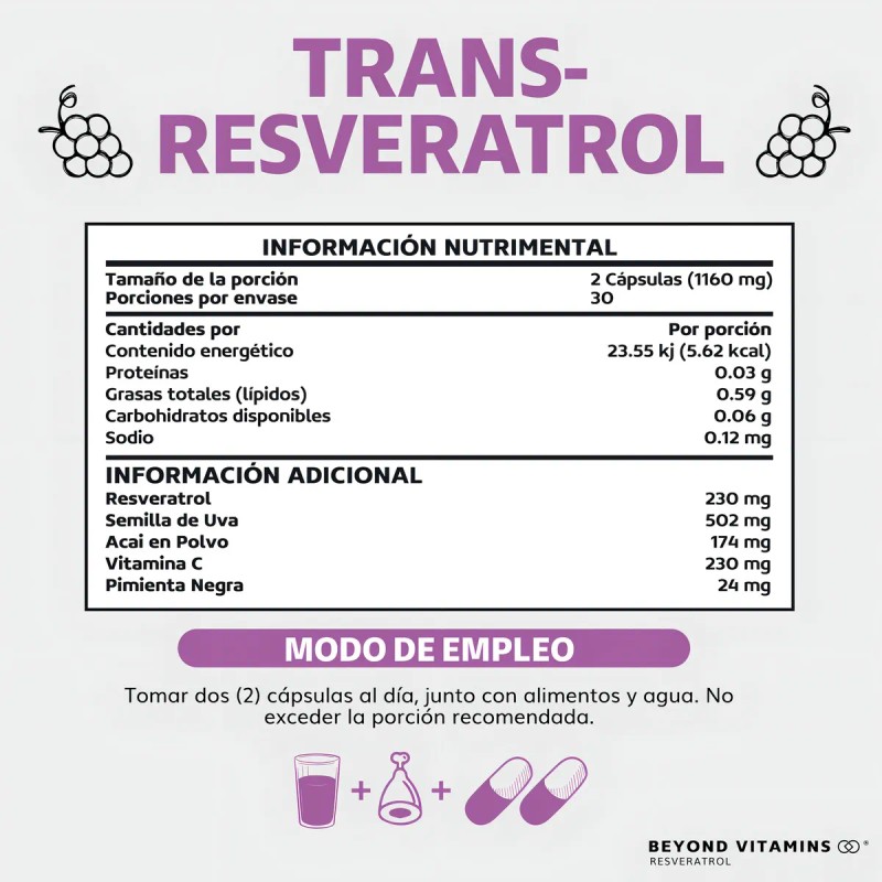- 🌿 Fórmula Vegana Completa: Resveratrol + Semilla de Uva + Acai + Vitamina C + Pimienta Negra.