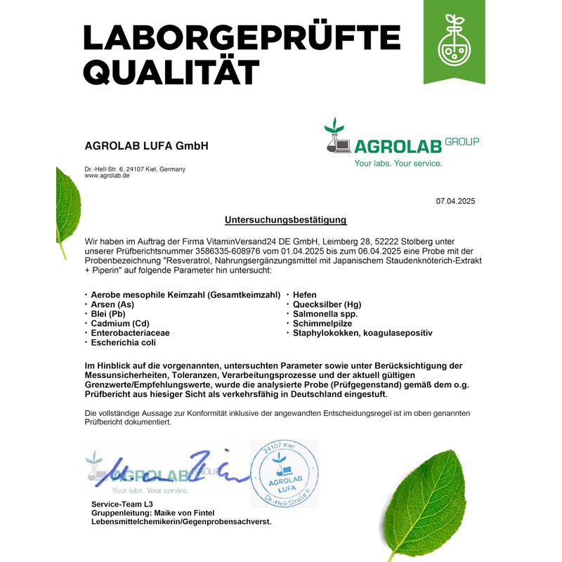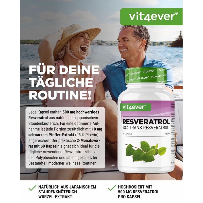 - 2 month supply: contains 60 high-dose capsules each with 520 mg active ingredient content - including 510 mg of real Japanese knotweed extract, of which 500 mg natural trans-resveratrol. Supplemented with 10 mg black pepper extract (of which 95% piperine) as a natural bioenhancer to support bioavailability. Practical supply for 60 days at the recommended daily dose of 1 capsule daily.