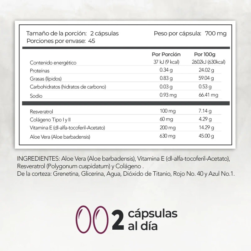 Este suplemento antioxidante combina resveratrol, aloe vera y vitamina E en cápsulas blandas de 700 mg, ideales para apoyar la salud cardiovascular, mejorar la circulación y fortalecer el sistema inmunológico. Cada frasco contiene 90 cápsulas, suficientes para un mes de uso.