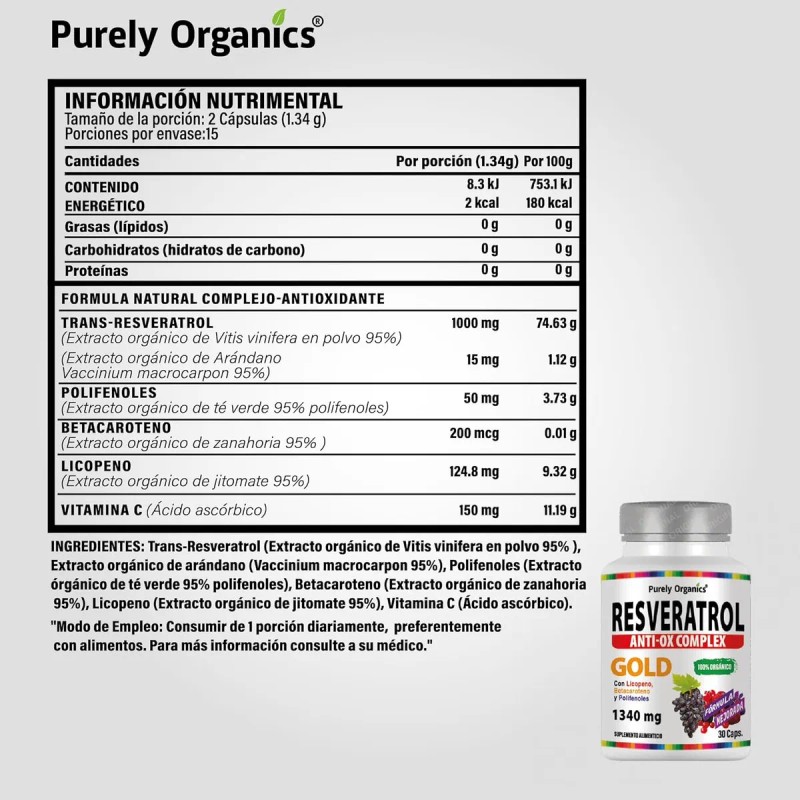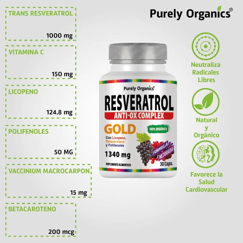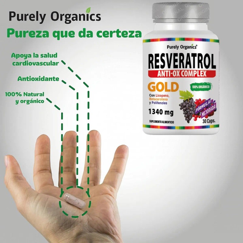 Resveratrol Anti-ox Complex Gold Antioxidante 30 Cápsulas sin sabor. Purely Organics.